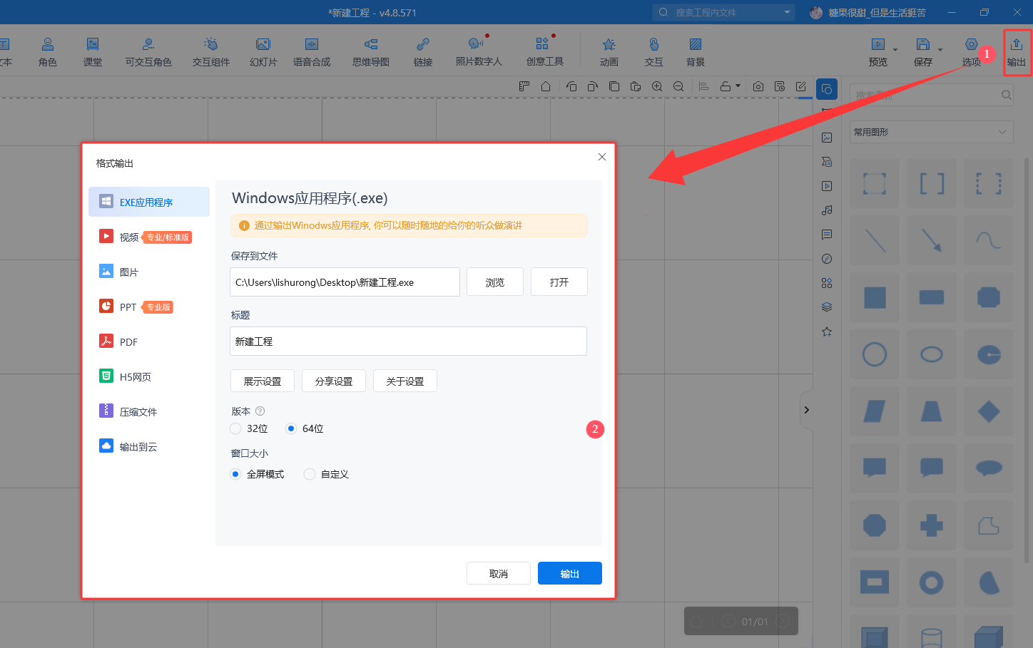 1.输出EXE应用程序:这种文件输出方式是把演示文件里的所有资源打包为一个独立的可执行文件,可以在Windows系统的电脑打开,具有良好的兼容性,是应用比较普遍的一种输出格式