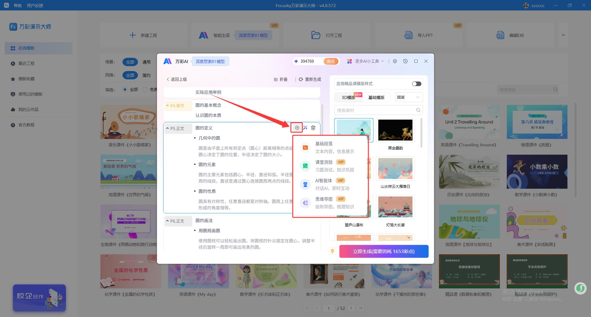 5、智能生成:支持添加多类型正文页,根据需求快速生成课堂活动、思维导图等页面,让课件页面效果更丰富